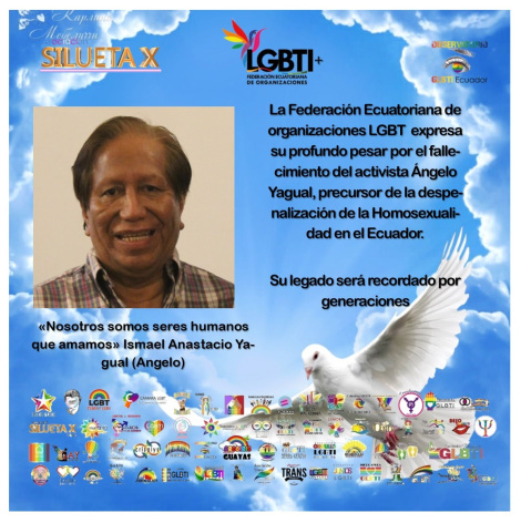 La Federación Ecuatoriana de organizaciones LGBT expresa su profundo pesar por el fallecimiento del activista Ángelo Yagual, precursor de la despenalización de la Homosexualidad en el Ecuador. Su legado será recordado por generaciones «Nosotros somos seres humanos que amamos» Ismael Anastacio Yagual (Angelo)