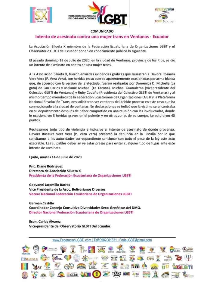 La Asociación Silueta X miembro de la Federación Ecuatoriana de Organizaciones LGBT y el Observatorio GLBTI del Ecuador ponen en conocimiento público lo siguiente.