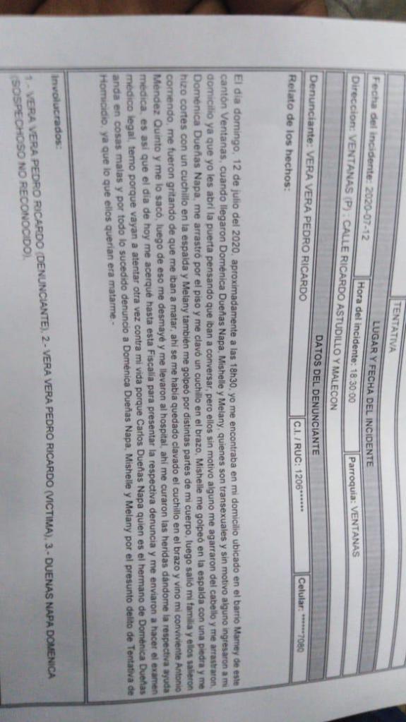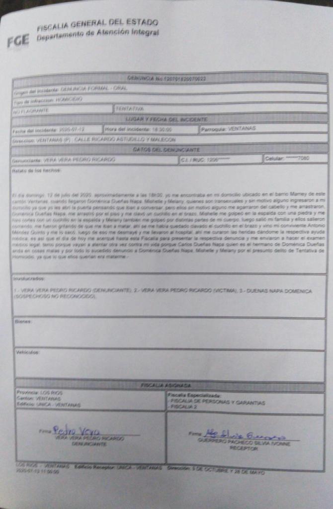 El pasado domingo 12 de Julio de 2020, en la ciudad de Ventanas, provincia de los Ríos, se dio un intento de asesinato en contra de una mujer trans.