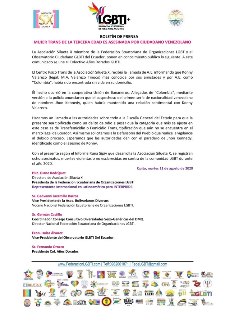 La Asociación Silueta X miembro de la Federación Ecuatoriana de Organizaciones LGBT y el Observatorio Ciudadano GLBTI del Ecuador, ponen en conocimiento público lo siguiente. A este comunicado se une el Colectivo Años Dorados GLBTI.