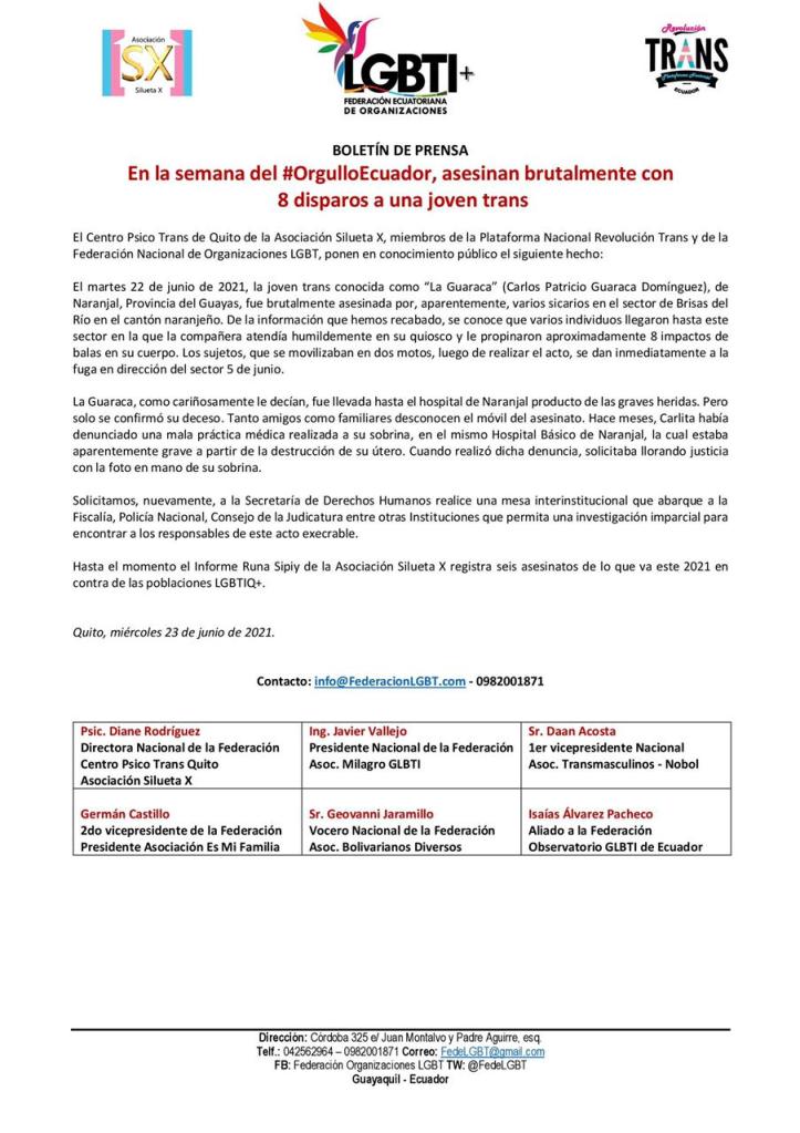 El martes 22 de junio de 2021, la joven trans conocida como “La Guaraca” (Carlos Patricio Guaraca Domínguez), de Naranjal, Provincia del Guayas, fue brutalmente asesinada por, aparentemente, varios sicarios en el sector de Brisas del Río en el cantón naranjeño. De la información que hemos recabado, se conoce que varios individuos llegaron hasta este sector en la que la compañera atendía humildemente en su quiosco y le propinaron aproximadamente 8 impactos de balas en su cuerpo. Los sujetos, que se movilizaban en dos motos, luego de realizar el acto, se dan inmediatamente a la fuga en dirección del sector 5 de junio.