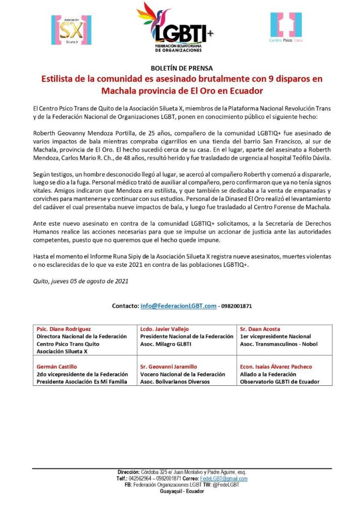 El Centro Psico Trans de Quito de la Asociación Silueta X, miembros de la Plataforma Nacional Revolución Trans y de la Federación Nacional de Organizaciones LGBT, ponen en conocimiento público el siguiente hecho: Roberth Geovanny Mendoza Portilla, de 25 años, compañero de la comunidad LGBTIQ+ fue asesinado de varios impactos de bala mientras compraba cigarrillos en una tienda del barrio San Francisco, al sur de
