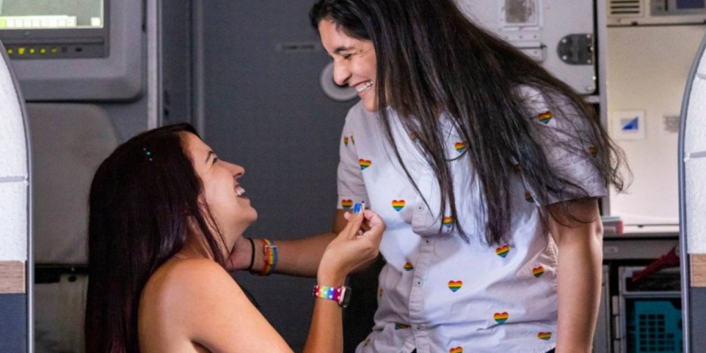 Ambas se conocieron en la misma aerolínea dos años atrás, explicó Alejandra, la piloto. El día de la pedida de mano, la aerolínea estaba en plena celebración del Orgullo con su lema «Fly with pride» por lo que engalanaron el avión de los colores del arcoíris y decidieron regalar a los pasajeros presentes en la pedida, otro vuelo para cada uno (de haberlo sabido me voy a Los Ángeles).