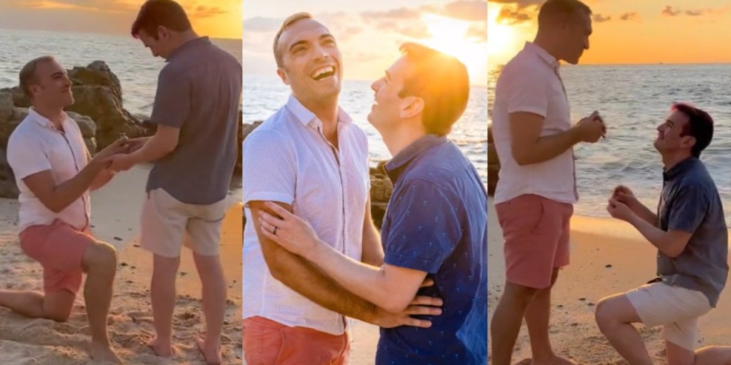 La pareja, que vive en Ohio, donde Corey trabaja como analista financiero y Trevor como enfermero, llegó a México para sus vacaciones. Y en su romántico paseo sucedió. Albert Harris fue el que captó esta singular petición de mano. Así que lo subió el vídeo a su cuenta de Tik Tok escribiendo. “De las 1250 propuestas que he captado en mi carrera esta es mi primera doble propuesta. ¡Felicitaciones a los dos!”.