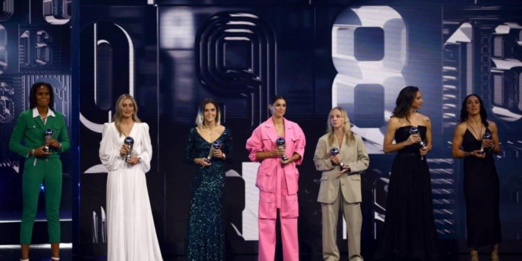 La primera, de izquierda a derecha, es Wendie Renard. Con un vestido blanco, la segunda de la fila, encontramos a Alexia Putellas, que ha sido premiada como la mejor jugadora de fútbol con el «The Best».