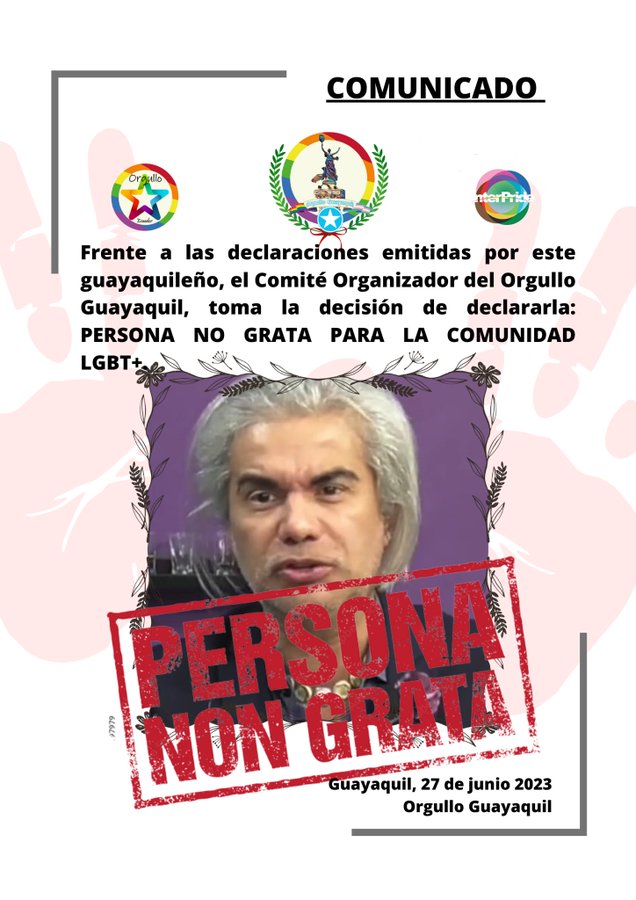 Frente a las declaraciones emitidas por este guayaquileño, el Comité Organizador del Orgullo Guayaquil, toma la decisión de declararla: PERSONA NO GRATA PARA LA COMUNIDAD LGBT+. Guayaquil, 27 de junio de 2023 #OrgulloGuayaquil.